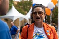 Maria Yareli Delgado, senior director of the Hispanic Serving Institution Initiatives, laughs with students during the 130th Birthday Bash on Sept. 5 at Brazos Park. Delgado said she enjoyed seeing UTA grow with its buildings for the students.