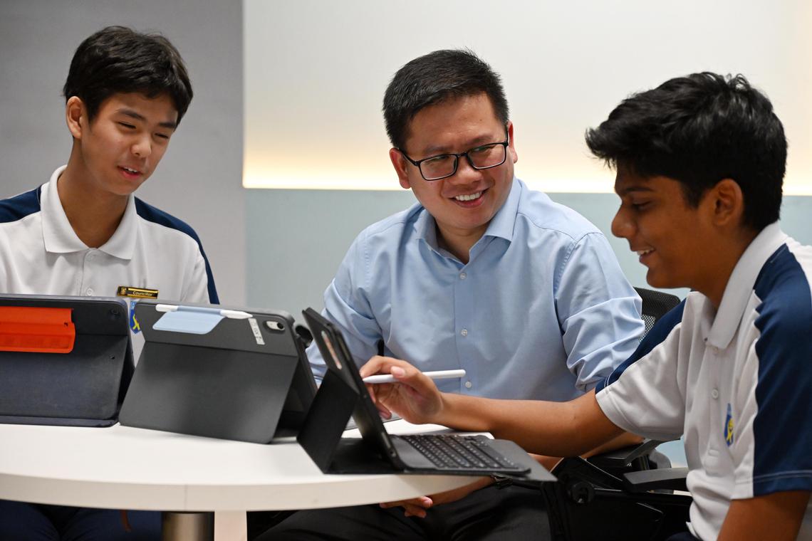 Mr Neo Guang Xian (centre) with Secondary 3 students William Teh (left) and Jain Arnav at a computing lesson at Ngee Ann Secondary School.