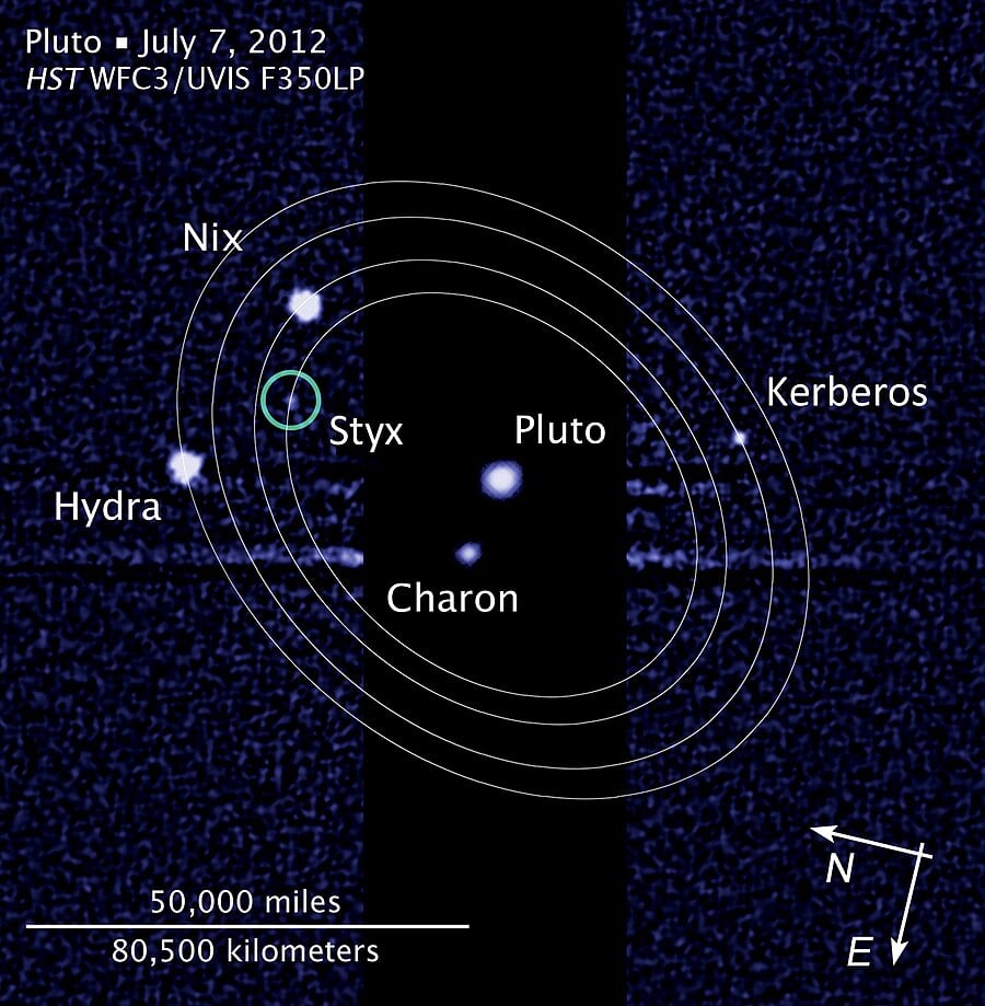 Illustration of Pluto's moons and their orbits overlayed on Hubble photo Hubble image of Styx (circled), with the outer moons’ orbits shown.
