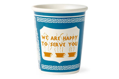 The cup, with its sunny “We Are Happy to Serve You” scrawl and Greek meander border, is a ceramic stand-in for the iconic, disposable 1963 Anthora takeout coffee cup, which was designed by Leslie Buck, a Holocaust survivor, and sold by the MoMA Design Store.