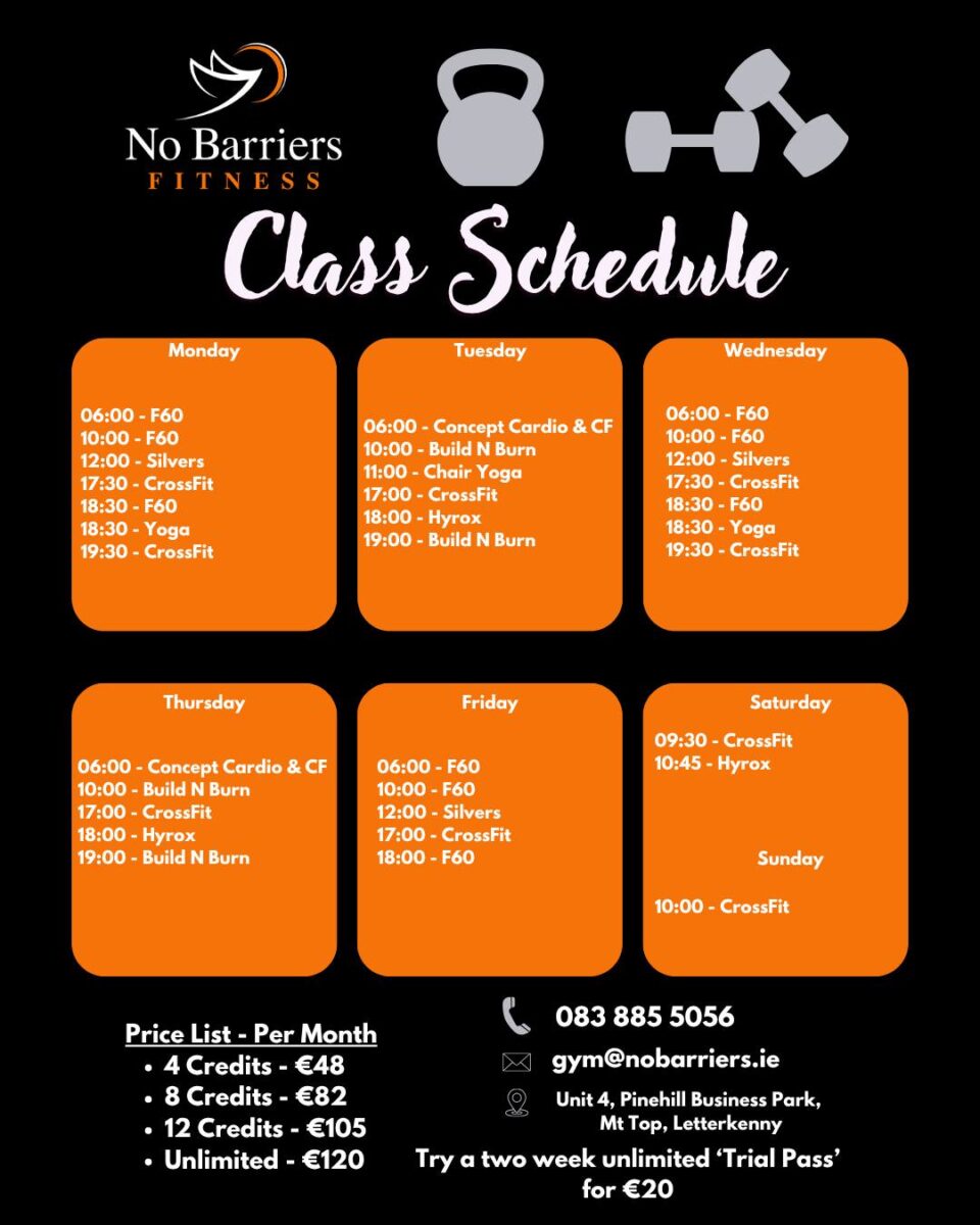 Try our 2-week unlimited trial pass for only €20. Check out the class schedule below and book your session by calling 0838855056 or messaging No Barriers Fitness on Facebook here.