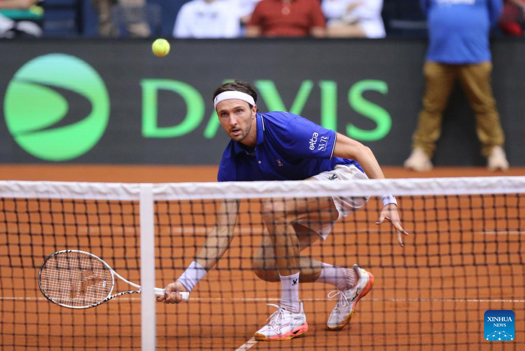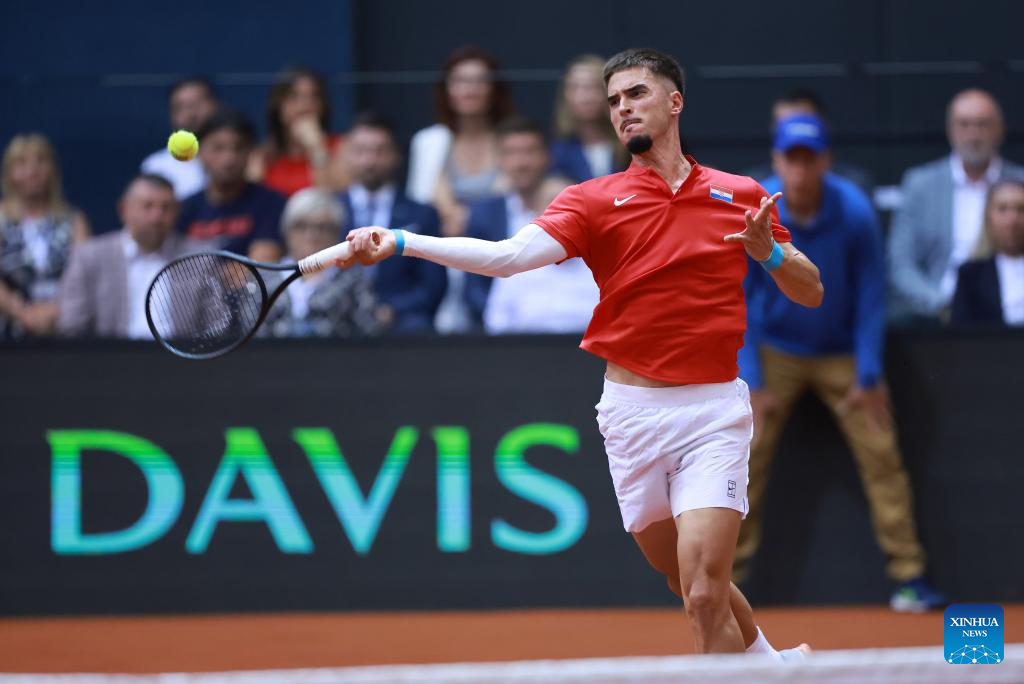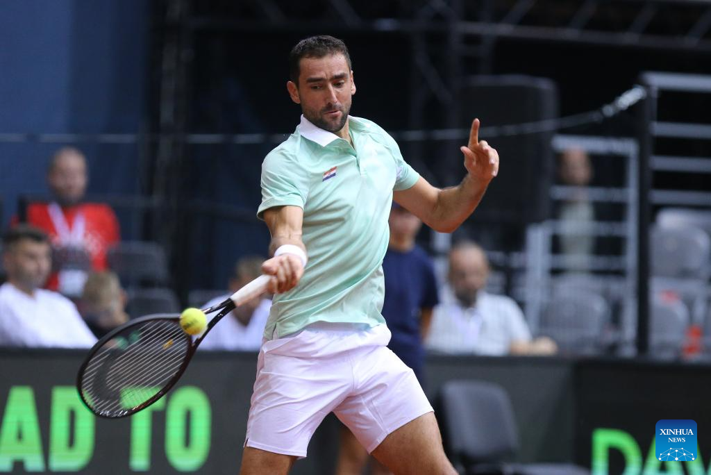 Marin Cilic of Croatia hits a return during the men’s singles match against Arthur Rinderknech of France at the 2025 Davis Cup Qualifier second round match between Croatia and France in Osijek, Croatia, Sept. 12, 2025. (Photo by Davor Javorovic/Pixsell via Xinhua)