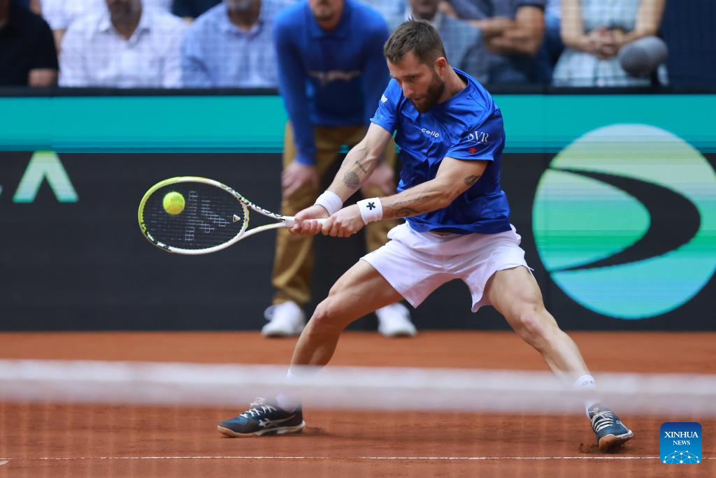 Corentin Moutet of France hits a return during the men’s singles match against Dino Prizmic of Croatia at the 2025 Davis Cup Qualifier second round match between Croatia and France in Osijek, Croatia, Sept. 12, 2025. (Photo by Davor Javorovic/Pixsell via Xinhua)