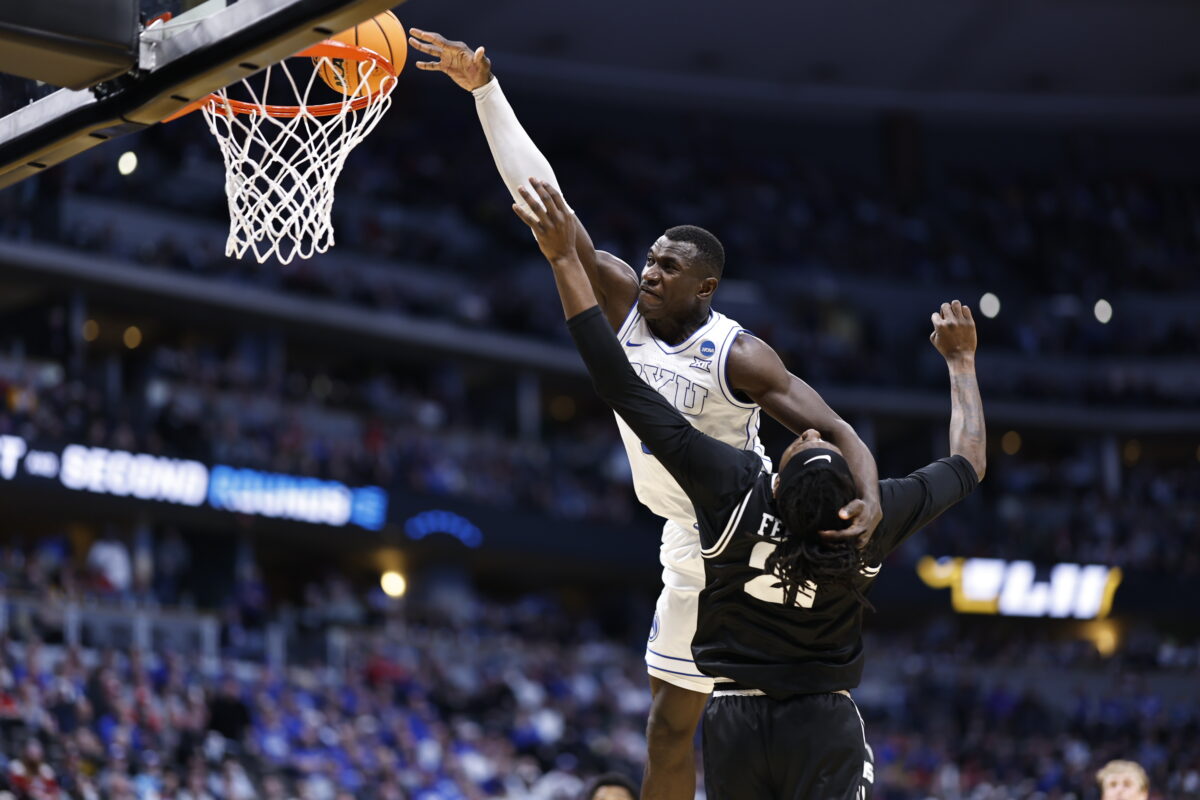 BYU’s Keba Keita (in white) attempts a dunk against VCU in an NCAA first round men’s basketball game at Ball Arena in Denver, Colo., on Thursday, March 20, 2025.