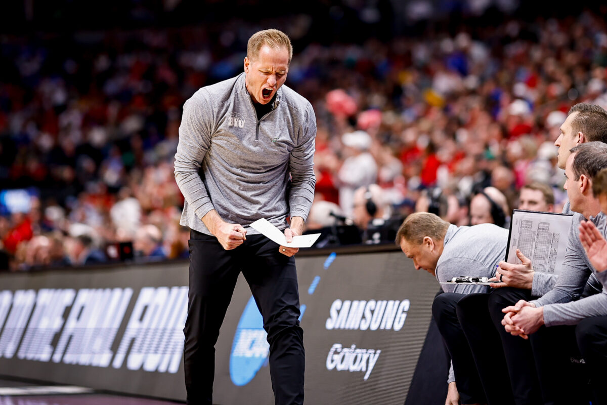 - BYU men’s basketball coach Kevin Young (left) reacts during a 91-89 victory against Wisconsin in the second round of the NCAA Tournament at Ball Arena in Denver, Colo., on Saturday, March 22, 2025.