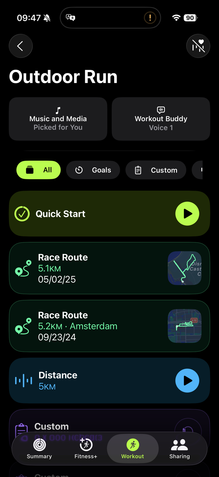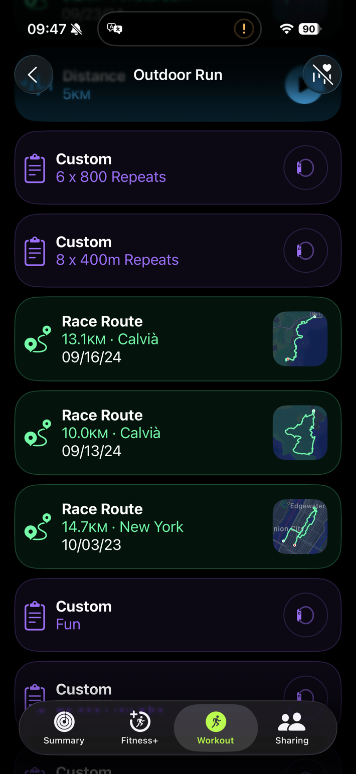 Now, you’ll see the new Workout Buddy options at the top, as well as the new ‘Picked for you’ music features. But, down below, you’ll also see the Race Routes in green (never seen before on the phone), and if you scroll further, you’ll see your custom workouts (in purple):