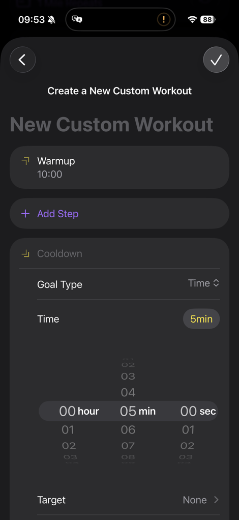 From there, I’ve got a workout builder where I can start tweaking things. I can open up any given section, including the warm-up and cool-down, to change those. This includes changing the goal type (time/distance/open) for those warm-up/cool-downs, as well as the target (pace/heart rate/cadence/power):