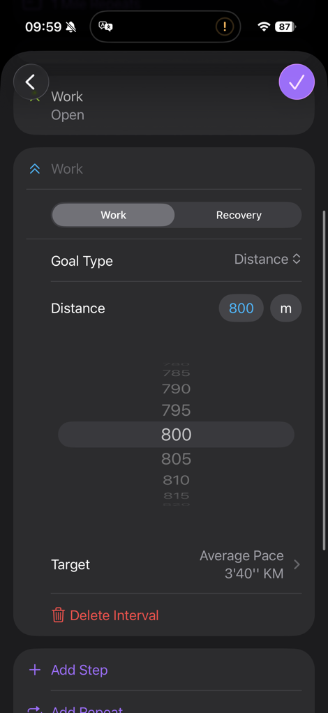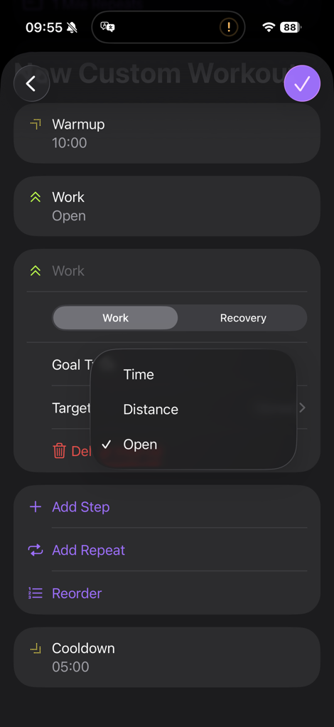Within the main set, I can create individual steps, or create repeats. For these, I have the classification type (Work/Recovery), the Goal Type (time/distance/open), and then the Target (pace/heart rate/cadence/power). For distance, I can choose miles, yards, kilometers, and meters.