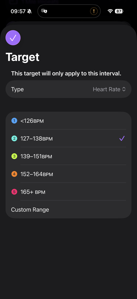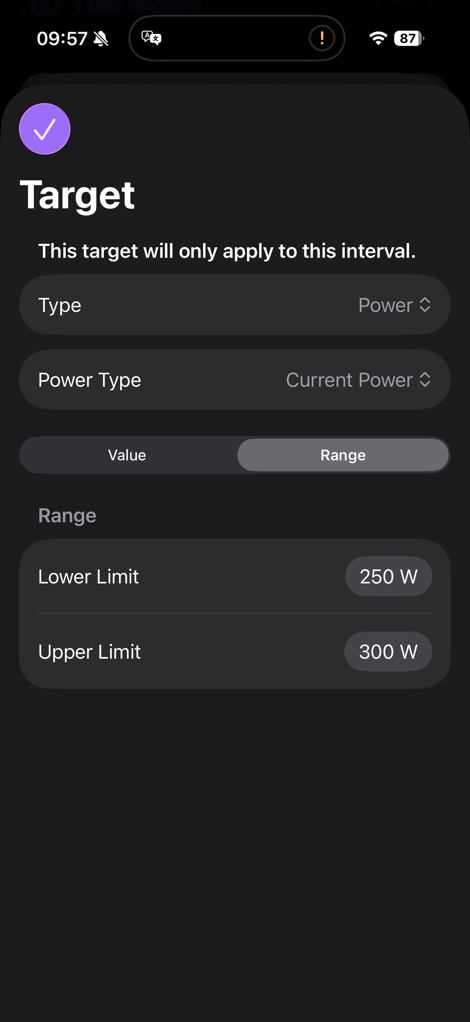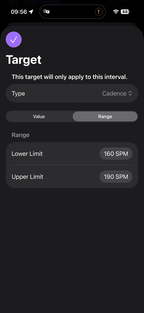 And for pace & power types, I can select ‘Average Pace/Power’ or ‘Current Pace/Power’. For cadence/power/pace, I can choose a set value or a range. For heart rate, I can select a heart rate zone or a custom range.