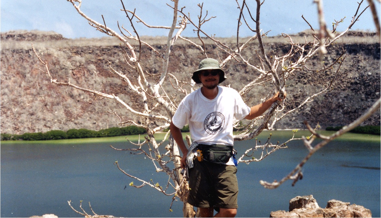 Abzhanov above the volcano crater lake in Genovesa on the Galapagos. Photo credit: Abzhanov’s personal archive