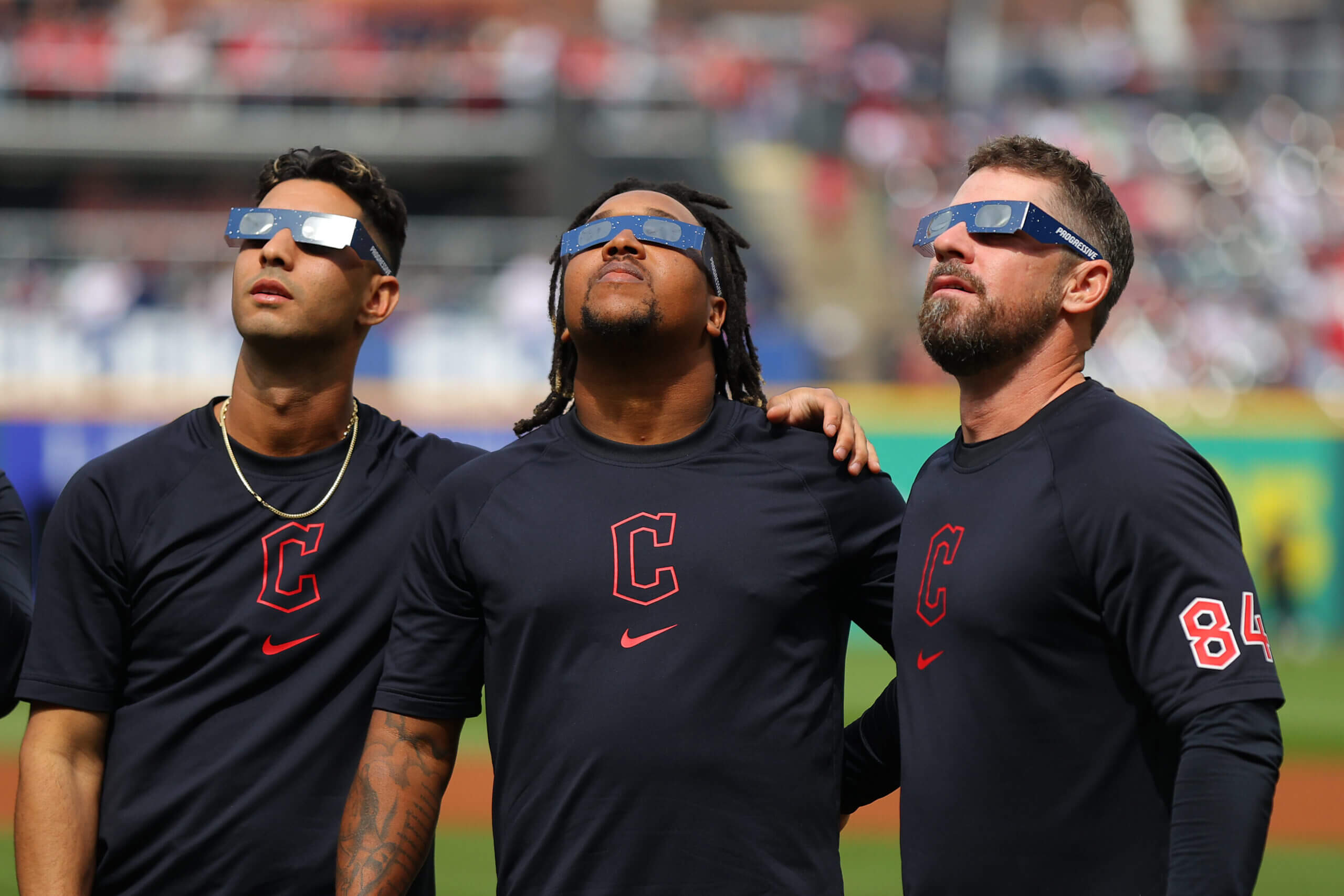 Ramírez, teammate Brayan Rocchio and coach J.T. Maguire took in the total solar eclipse before the 2024 home opener. (Mike Lawrie / Getty Images)