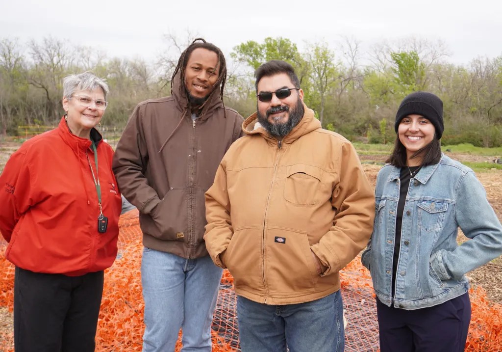 From left to right: Linda Fulmer, Jhamal Huckaby, Jesse Herrera and Ashley Munoz stand in front of Tabor Farms on March 20, 2023 at 4951 East Berry Street. Here, they work to produce food for the eastside community. (Rachel Behrndt | Fort Worth Report)