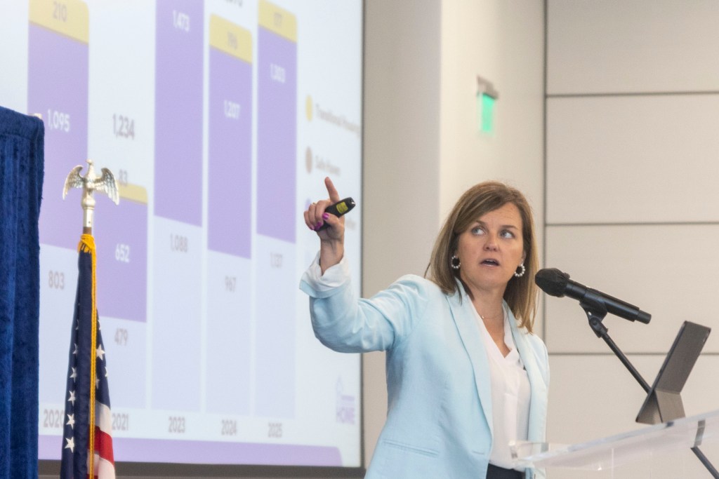 Lauren King, executive director of Partnership Home, shows homelessness data from 2020 to 2025 during a State of Homelessness Address on May 21, 2025, at Texas Wesleyan University. (Mary Abby Goss | Fort Worth Report)