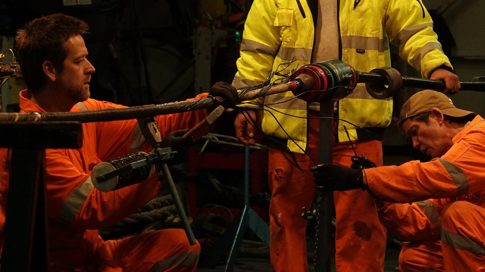 The workers seal the intact end, attach it to a buoy, and drop it into the sea. They then strip the broken section, exposing delicate hair-thin glass fibers, which they fuse with fresh cable. A speck of dust or even a tiny misalignment would ruin the joint and they would have to start over.