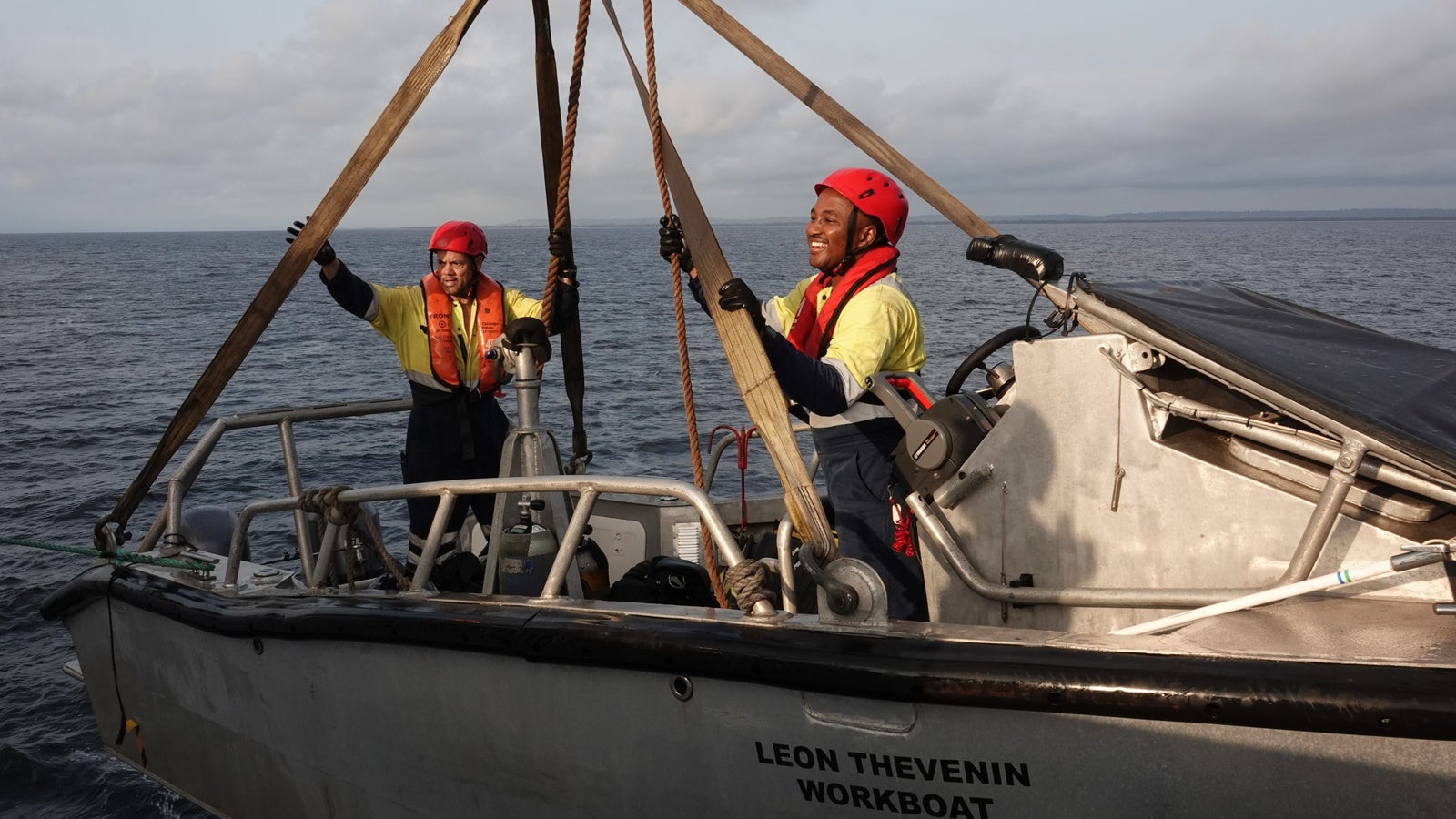 Kevin Willenberg (left), able seaman, and officer Charles Khumbuza support operations on the main vessel from a small boat alongside it.