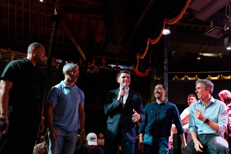 Former San Antonio Mayor Ron Nirenberg (second from left), state Rep. James Talarico (D-Round Rock), U.S. Rep. Joaquin Castro (D-San Antonio) and Beto O’Rourke are all considered potential statewide contenders for Texas Democrats in 2026. Credit: Brenda Bazán / San Antonio Report