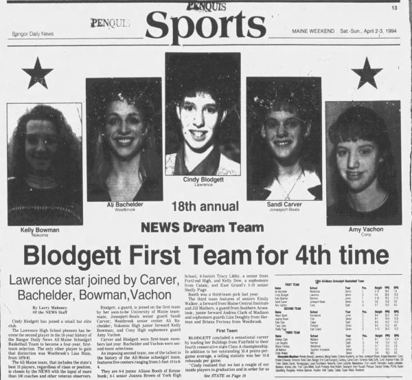 “She can score, rebound, handle the ball and play good defense,” former Nokomis coach Charlie Wing said in a 1994 edition of the Bangor Daily News. “She’s a very well-rounded player who does everything well. She also has a tremendous desire to succeed and is very coachable. I wish I had a dozen Kelly Bowmans.”
