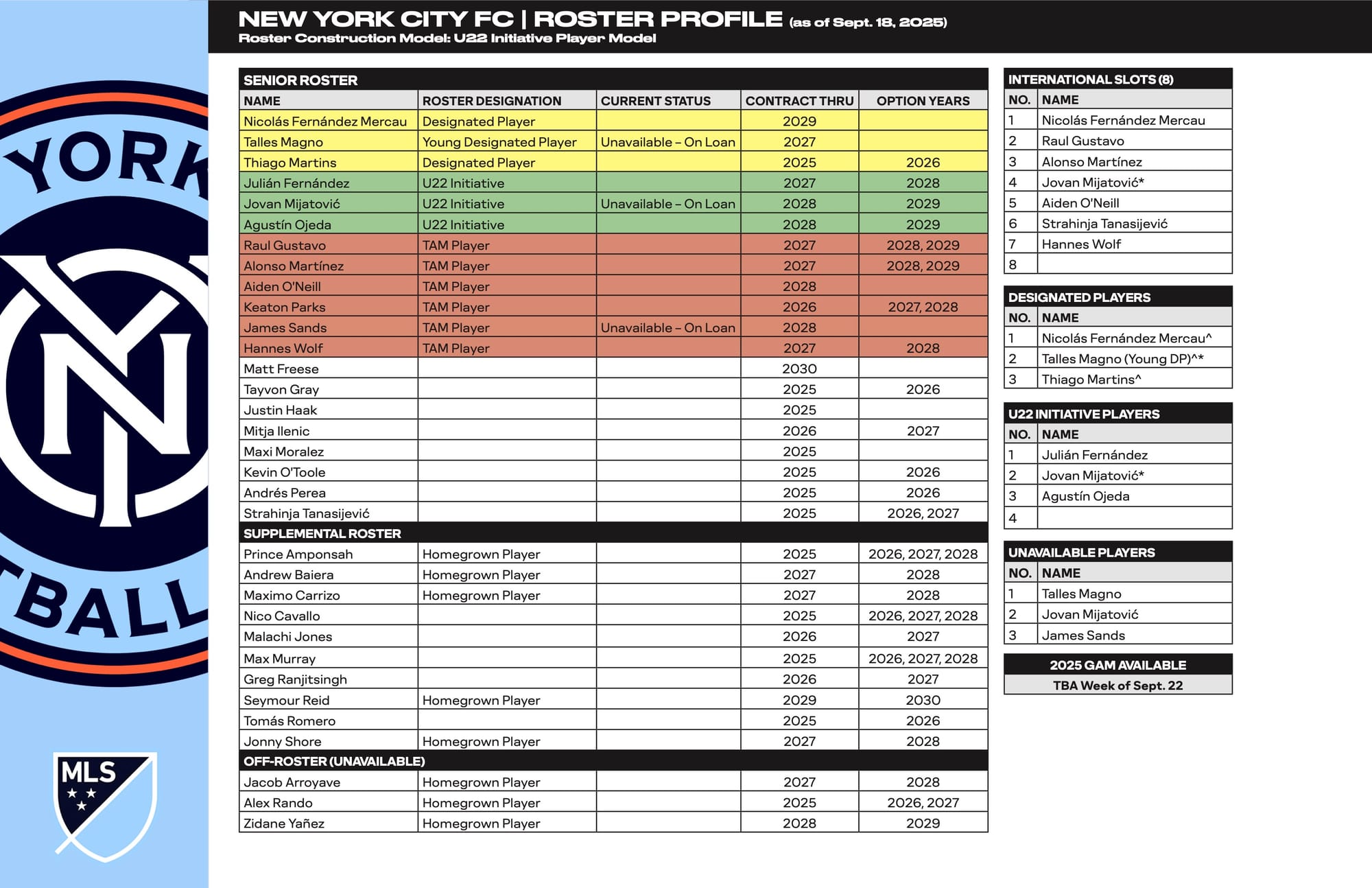 Major League Soccer today released the fall update for the 2025 Club Roster Profiles for all 30 teams, giving us a complete picture of where the New York City FC roster stands as the regular season winds down and the playoffs get ready to heat up.