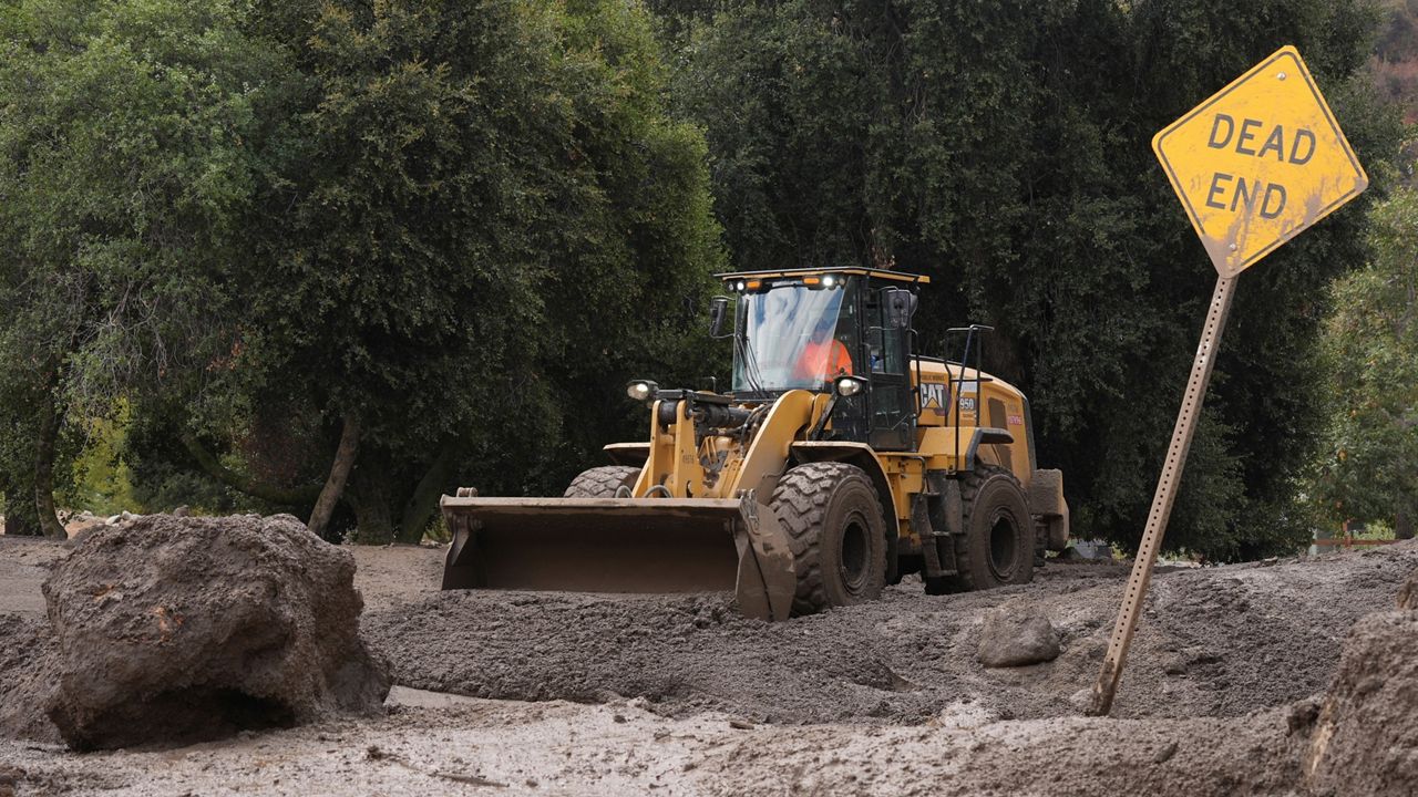 Workers clean up the damage caused by mudslides after storms in Yucaipa, Calif. on Friday. (AP Photo/Damian Dovarganes)