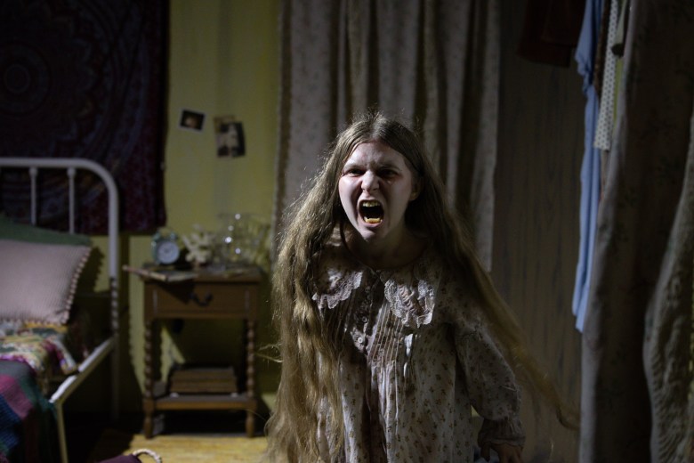 A Fright Fest actor in the Conjuring haunted house jumps out to scare parkgoers on opening night at Six Flags Fiesta Texas in San Antonio on Sept. 6, 2025. Credit: Diego Medel / San Antonio Report