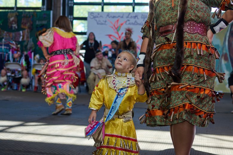 A young dancer wearing a Jingle Dress looks up towards an elder. (Hanbit Kwon)