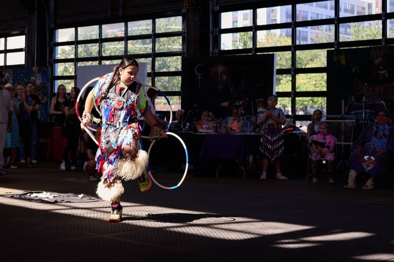 Throughout the afternoon, performers filled the stage and the dance circle. Intertribal dances, dances honoring Philadelphia Indigenous leaders, and a hoop dance offered layers of cultural storytelling. Social dances encouraged participation from event attendees, bridging the gap between performers and the audience.