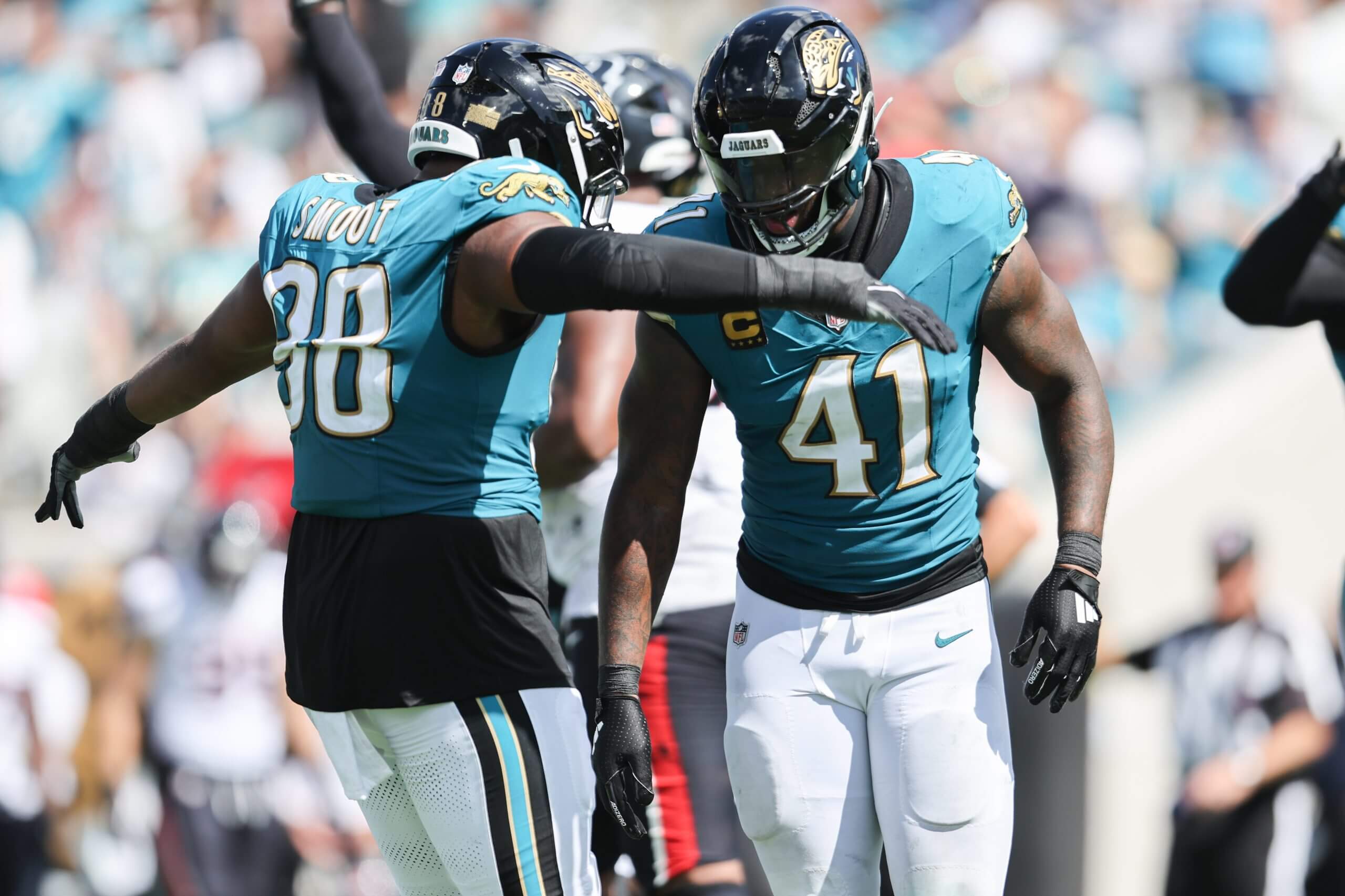 Josh Hines-Allen celebrates a sack with Dawuane Smoot. Hines-Allen finished with three QB hits on the day. (Morgan Tencza / Imagn Images)