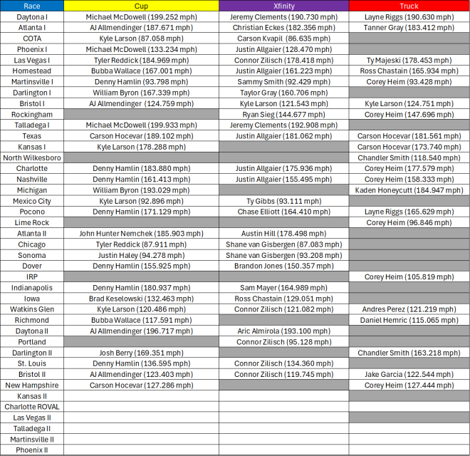 Of the 78 race winners, 18 of them went on to earn the fastest lap bonus. Seven of the 8 winners scored the maximum 61 points (race win, two stage wins & the fastest lap): Kyle Larson in the Cup race at Kansas, Larson in the Xfinity race at Bristol, Justin Allgaier in the Xfinity race at Nashville, Connor Zilisch in the Xfinity race at Portland and Corey Heim in the Truck races at Charlotte, Lime Rock and New Hampshire.