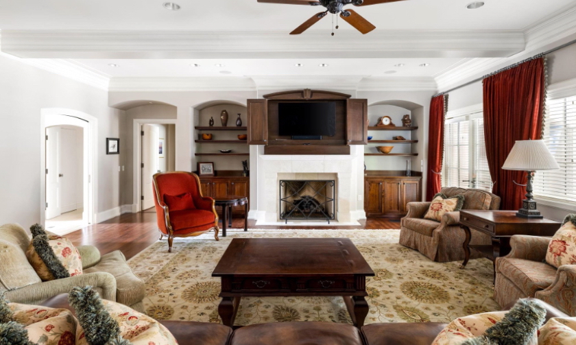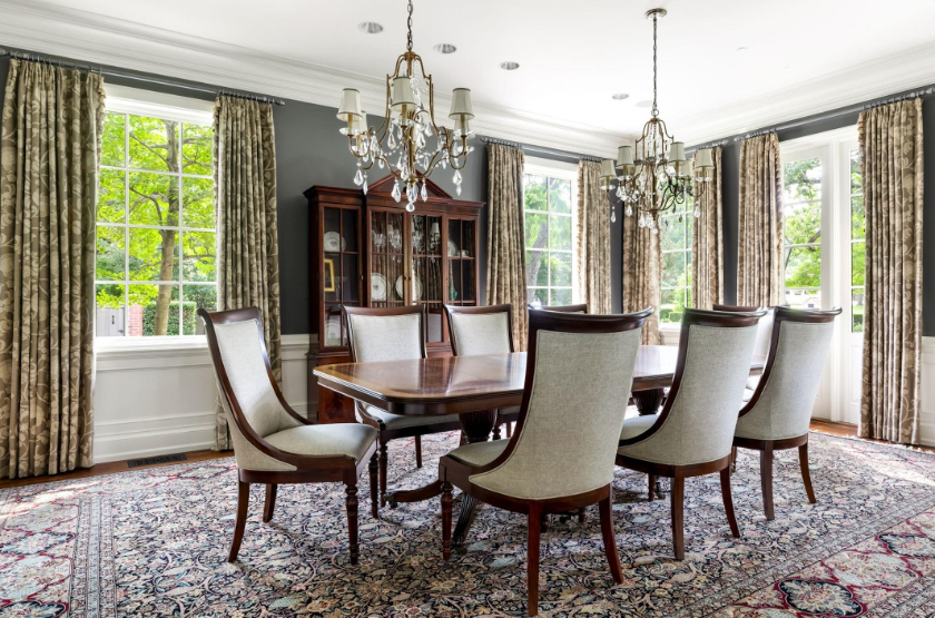 You can tell no expense was spared building the 9,865-square-foot, six-bedroom, seven-bathroom home. The moment you step inside the dramatic entry, the marble floors, a sweeping staircase, and traditional layout set the classic tone. Elegant millwork runs throughout the house and is especially prominent in the library.