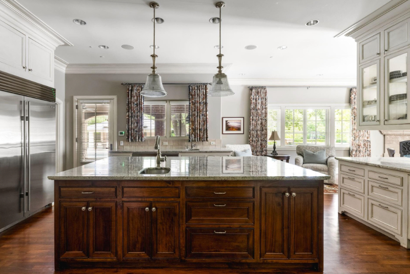 That French Provincial character is apparent in the warm, open, and inviting kitchen. Of course, you will find Sub-Zero and Wolf appliances, as well as a large center island, but it’s the seamless flow into the keeping room that feels so distinctly French. You can just imagine gathering around the fireplace with a cup of tea, looking out at the garden on a crisp fall day.