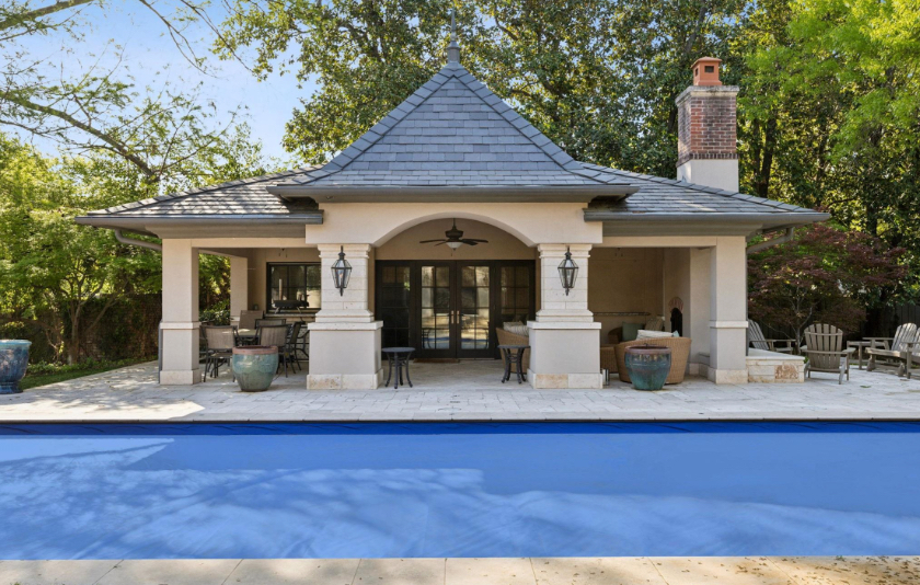 As much thought was put into the exterior as the interior. There is a beautiful pool, a cabana with a Murphy bed, a covered loggia with phantom screens, a fireplace, and an outdoor kitchen. Chris likes to play basketball, so he wanted a half-court.