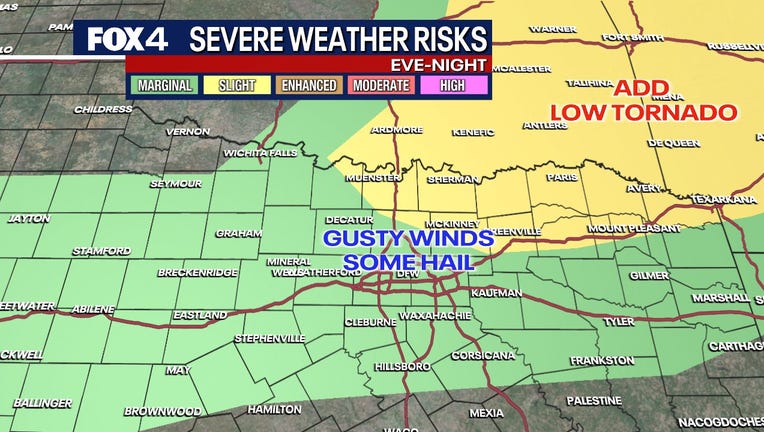 The change arrives late in the afternoon as a cold front will begin to push into DFW’s northern and northwestern counties. Scattered thunderstorms are expected to develop. These storms could be strong to severe, with the main threats being gusty winds and hail.