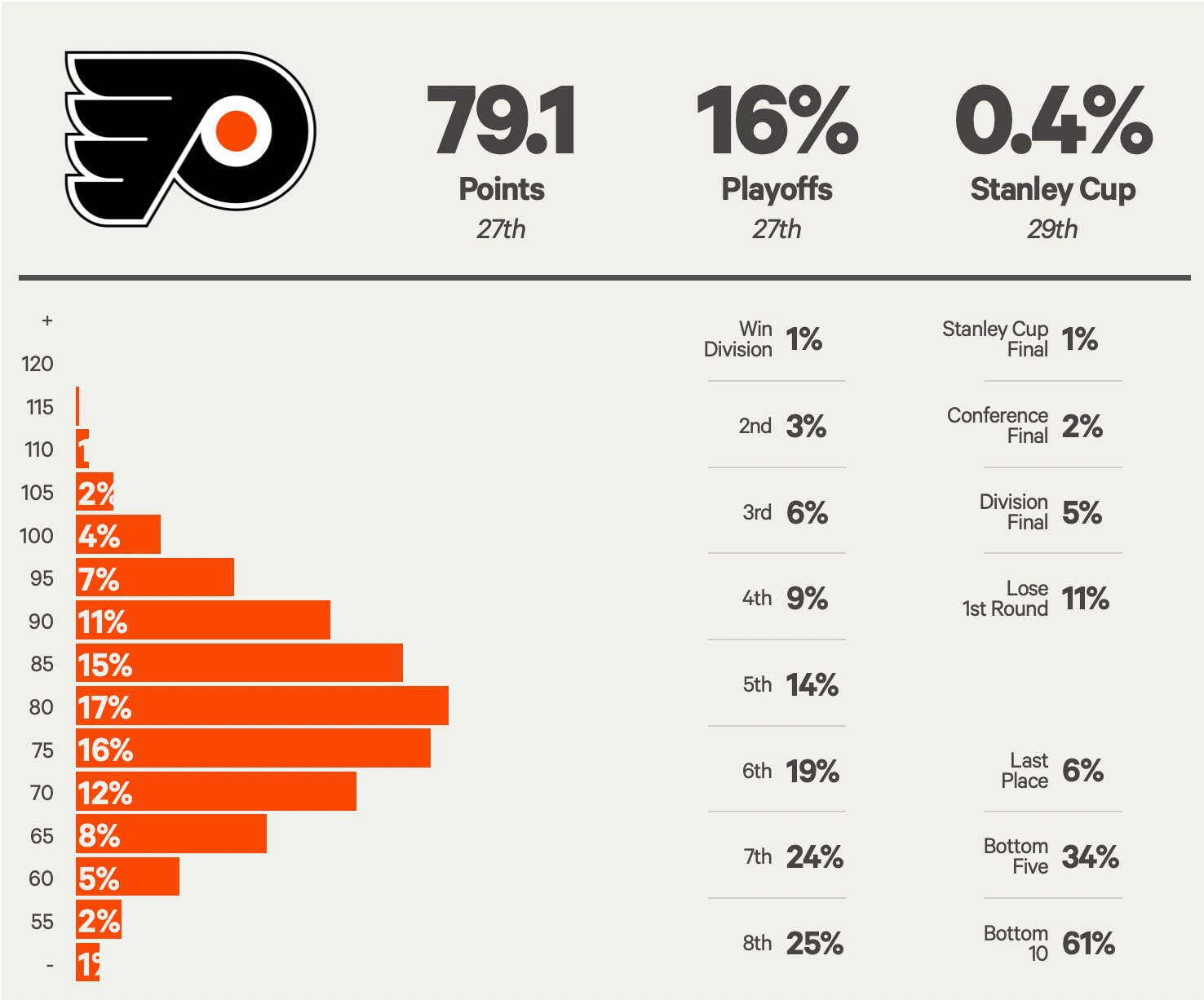The Flyers aren’t going full scorched earth with their rebuild, which is probably the right call for cultural reasons. But it may also limit the team’s ultimate upside. For the sake of the rebuild, the Flyers will probably need some (bad) luck on their side. An 80-point year isn’t bad enough.