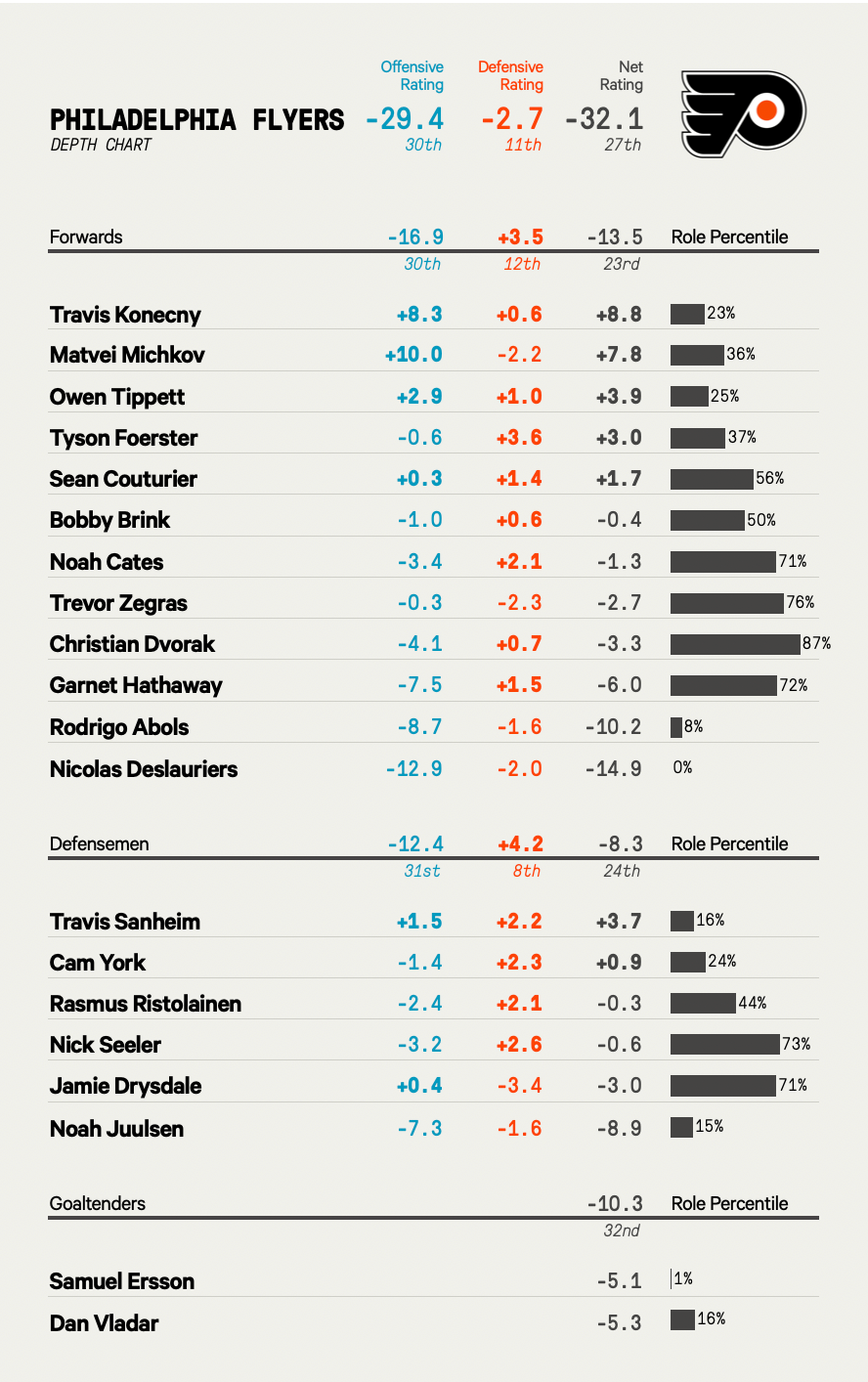 Konecny driving the Flyers is also a part of the problem. In a perfect world, he would be the team’s second- or third-best forward and not The Guy. A plus-8.8 Net Rating is in line with the average No. 2 forward. Michkov is on track to take over that role someday, but until that happens (or another star emerges), it slots most of the lineup above their depths.