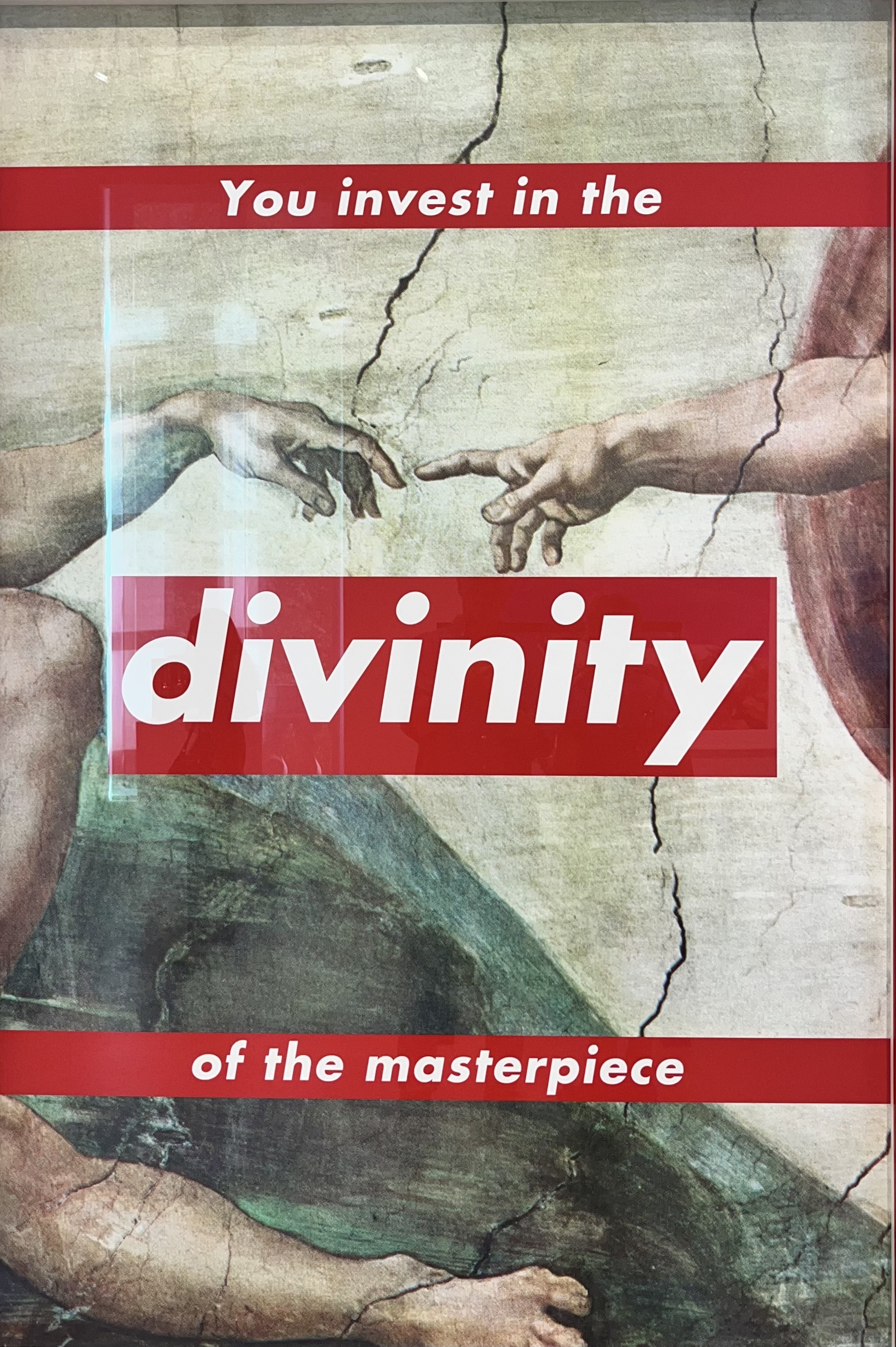 Barbara Kruger’s untitled 1982 work appropriates the finger touch moment from Michelangelo’s “Creation of Adam,” overlaying it with the message “You invest in the divinity of the masterpiece” in her signature red bars and bold typography. Here, she suggests that in greed-is-good New York, witnessing the masterpiece is no longer enough, now you must also invest in it.