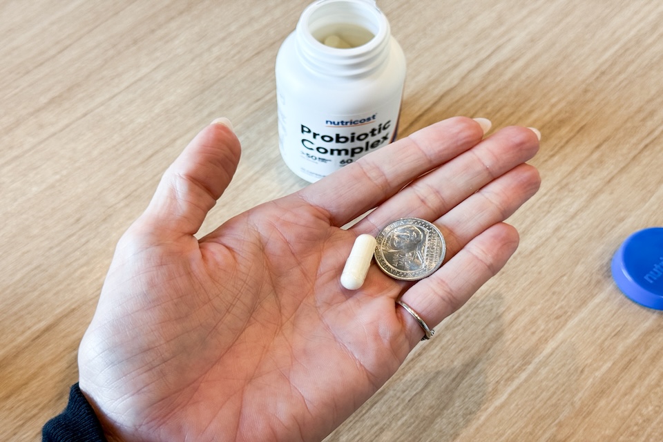 Of the pill itself, Kate says, “It’s a typical double encapsulated pill that’s enterically coated. The coating helps protect the second capsule when traveling through the stomach, so that the second capsule can break down in your body.” She rated the ease of taking the capsule as a 3 out of 5.