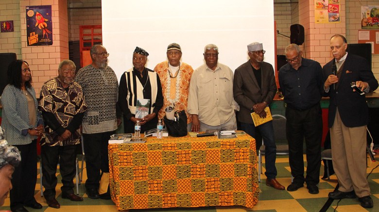 (L to R) Brenda Greene, Askia Muhammad Touré, Kalamu ya Salaam, Eugene B. Redmond, Useni Eugene Perkins, Woodie King Jr., Herb Boyd, Michael Simanga, and Haki R. Madhubuti. Credit: Third World Press Foundation