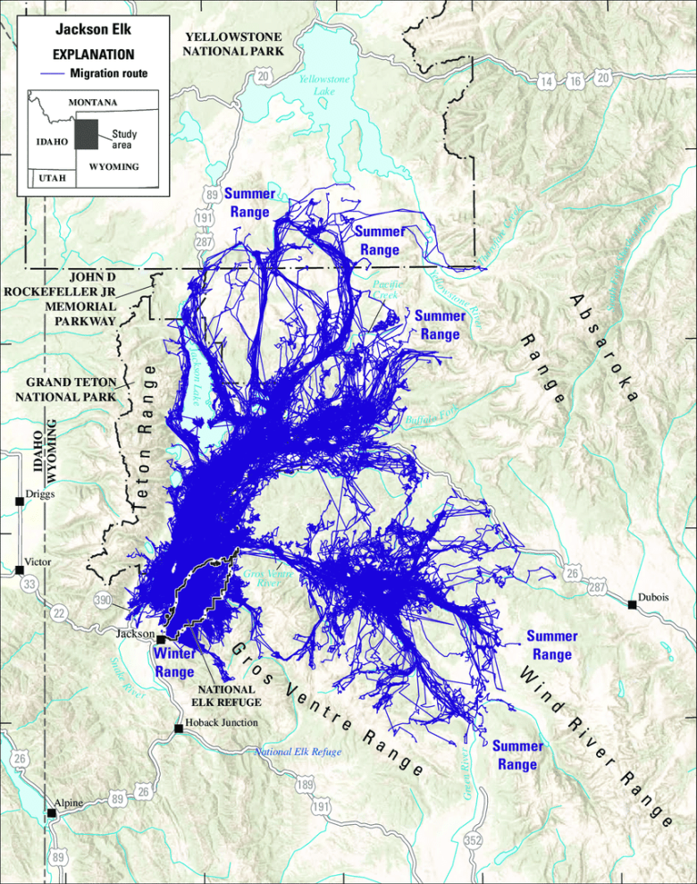 Migrating animals in the Jackson Elk Herd travel an average one-way distance of 39 miles, with journeys topping out at 168 miles. The routes are delineated in this map from the U.S. Geological Survey’s Ungulate Migrations of the Western United States, Volume 1. (USGS)