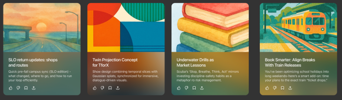 Each report is displayed as a “card” featuring AI-generated images and text. Users can click on each one to get the full report, and can then query ChatGPT about the contents. Pulse will proactively generate some reports, but users can also ask Pulse for new automated reports or offer feedback on existing ones.