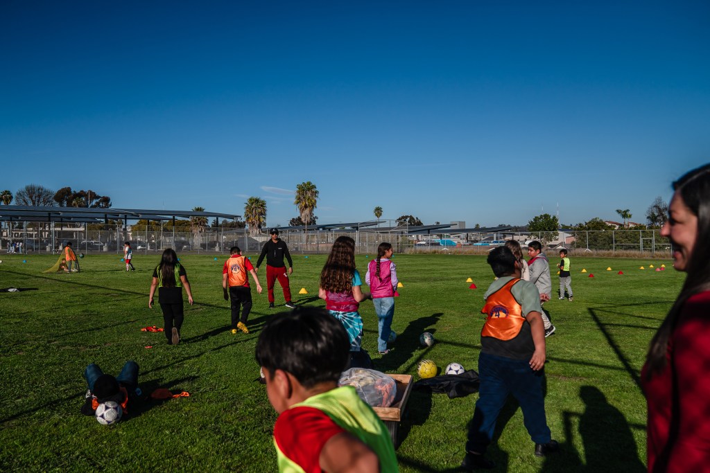Children play soccer after school at Chollas-Mead Elementary School on Feb 19, 2025. / Ariana Drehsler for Voice of San Diego