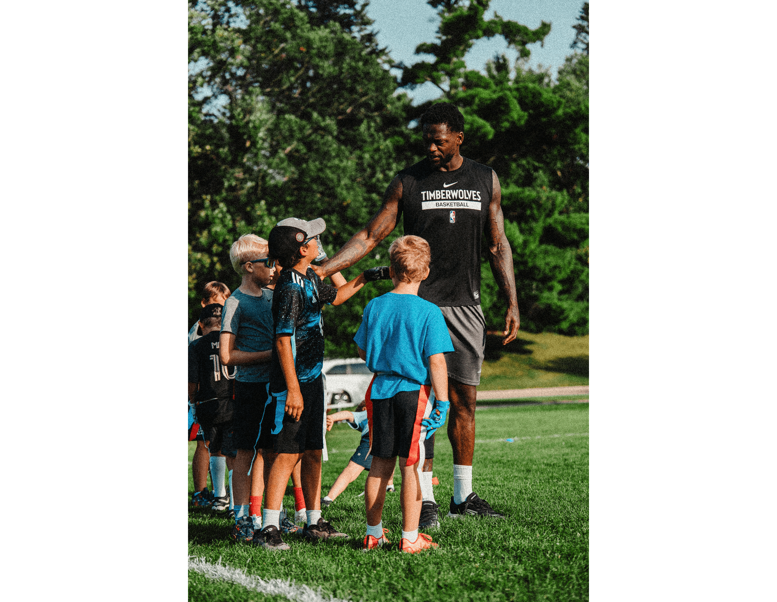 Just over two weeks from training camp, Randle has not come here to get in a workout as he prepares for his second season with the Minnesota Timberwolves. He is carrying a plastic bag from DICK’S Sporting Goods in one hand, and as soon as he steps onto the green grass, he is surrounded by the third-graders from the Hawkeyes flag football team. He reaches into the bag and pulls out the white belts with blue and red flags attached to the hips and starts helping each 8-year-old strap them to their waist.