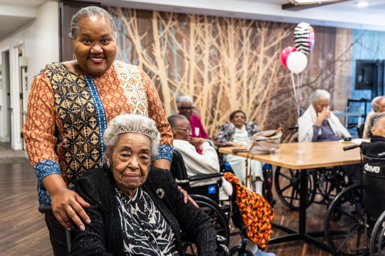 100 year-old Mary Brown and her niece Linda Earland, who visits and helps Brown manage her medical care, at the Simpson House’s Centenarian Day, September 22, 2025. (Kimberly Paynter/WHYY)