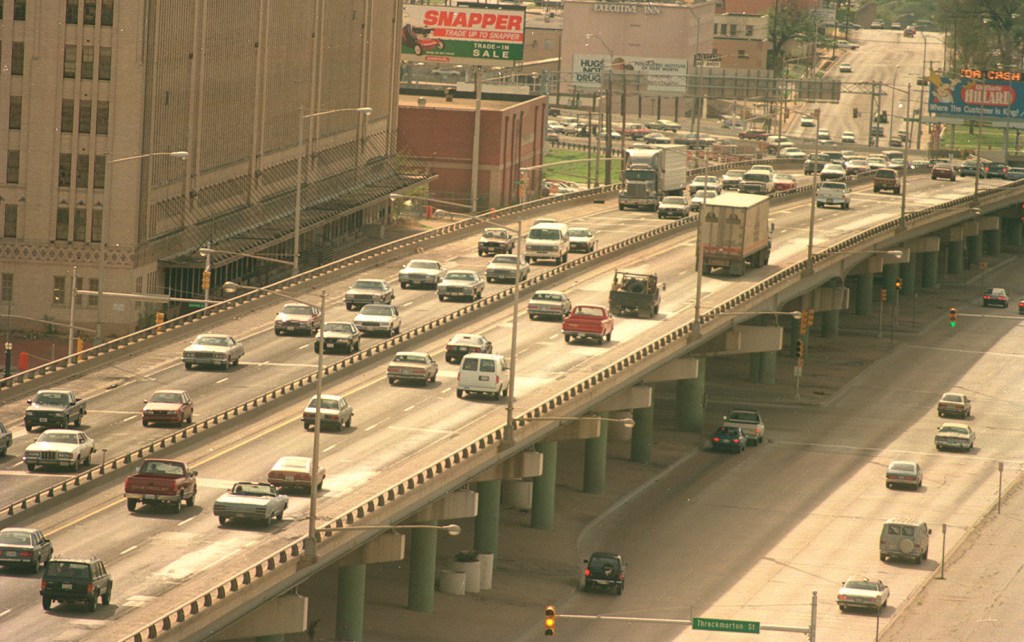 A section of I-30 overhead used to pass over Lancaster, hindering renovation efforts on the neighboring T&P. (Courtesy photo | Fort Worth Star-Telegram Collection of UTA Special Collections)