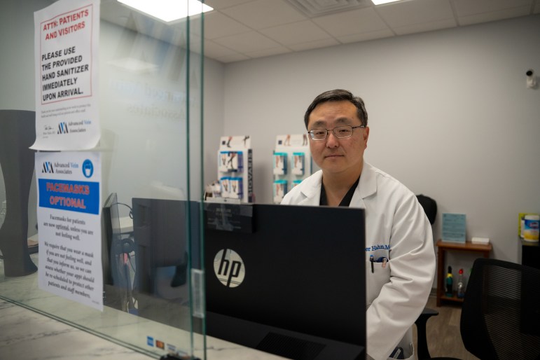 Dr. Peter Hahn, a cardiac electrophysiologist, works on his computer at Advanced Vein Associates in Uncasville on Sept. 15, 2025. Hahn is concerned that a new reimbursement policy announced by Aetna and Cigna will result in lost revenue and increased administrative burden for his private practice. Credit: Dana Edwards / CT Mirror