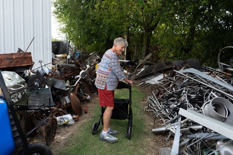 Rebecca Low walks through a portion of the “treasure yard” behind her west Fort Worth art gallery on Sept. 5, 2025. The lot is filled with metal scraps and old car parts that she transforms into sculpture art. (David Moreno | Fort Worth Report)