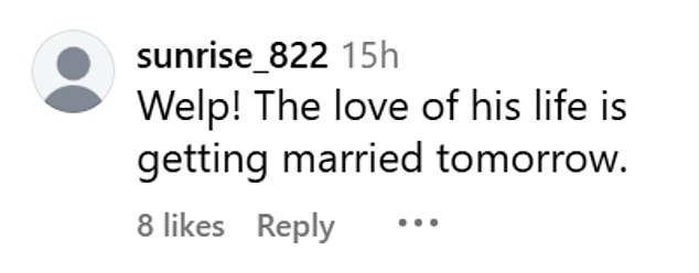 ‘Welp! The love of his life is getting married tomorrow,’ another wrote.