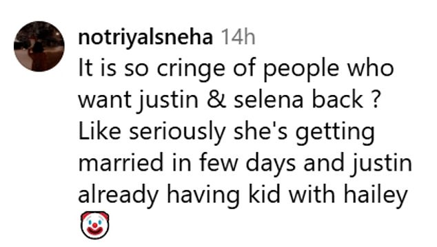 A sixth said, ‘It is so cringe of people who want Justin and Selena back ? Like seriously she’s getting married in few days and Justin already having kid with Hailey [Bieber].’