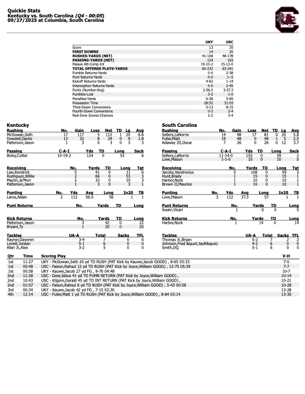 South Carolina defeated Kentucky 35-13 on Saturday at Williams-Brice Stadium. The Gamecocks have now won four straight in the series. Mark Stoops‘ last SEC win was 364 days ago. Kentucky has lost eight straight games to Power Conference foes, with a 1-11 record in their last dozen games.