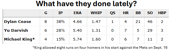 I wrote in yesterday’s newsletter (here) about the dangers of starting Darvish against the Cubs. And anyone who watched Cease pitch this season knows why there would be reservations about him being on the mound to start a playoff game, though the Padres appear to be leaning that way based largely on his 0.96 ERA over his past three starts against the Cubs.