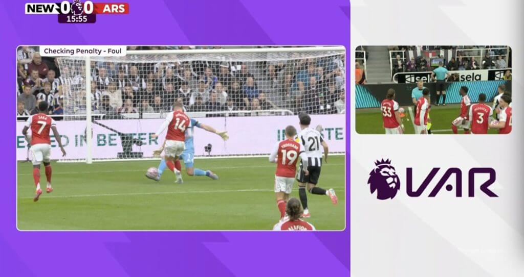 That was deemed enough to overturn Gillett’s initial call. He announced: “After review, the Newcastle goalkeeper plays the ball, and there is no foul. The final decision is drop ball.”